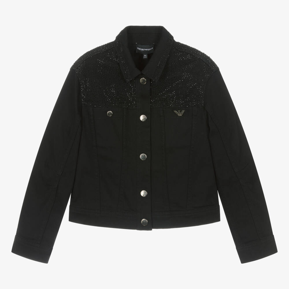 Effortlessly cool, this black denim jacket for teen girls is by Italian brand, Emporio Armani. Super stylish, it has black diamanté embellishments on the shoulders and the pointed collar for a subtle touch of sparkle. The pewter-tone Eagle logo on one chest pocket matches the branded popper fastenings on the front and the cuffs, for a distinctive finish. Ideal for dressing up or down, this layering piece will be a great addition to any wardrobe.