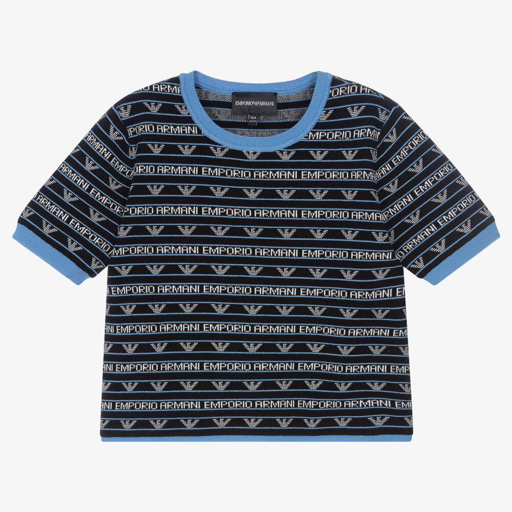 Black short sleeved sweater for teen girls by Emporio Armani, with an all-over white Eagle logo design. Beautifully knitted in a soft, stretchy jacquard, this signature piece is designed with contrasting blue trims and a ribbed crew neck.