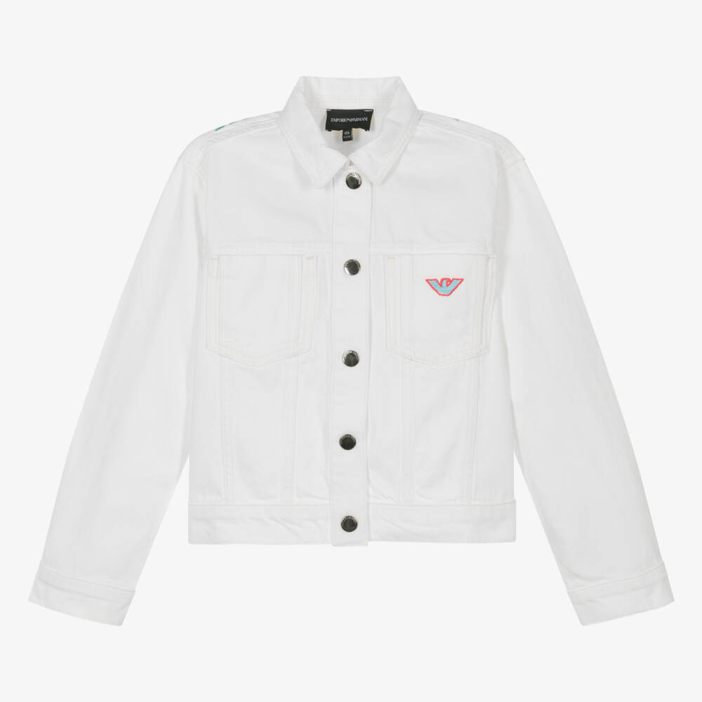 A stylish ivory jacket for teen girls from Emporio Armani, embroidered with multicoloured logo designs on the back. Unmistakably designer, this long-sleeved jacket is made in non-stretch cotton denim with contrast ivory topstitching and branded popper fastenings in dark silver. The collared neckline and two chest pockets finish this casual design, along with a blue and pink Eagle motif on the front.