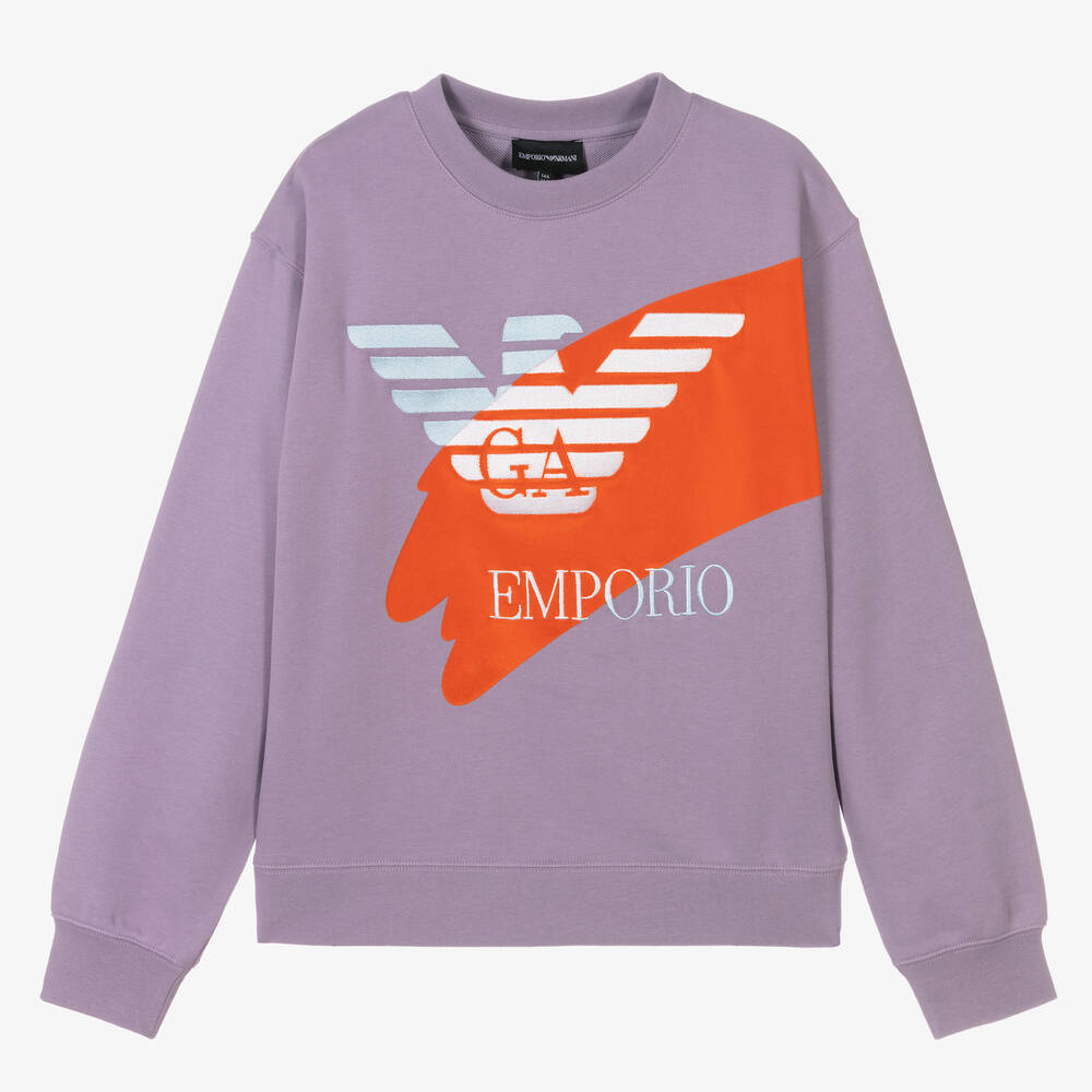 Logo-inspired purple sweatshirt for teen girls by Emporio Armani. In a relaxed boxy fit, this organic cotton sweatshirt has a blue and white logo Eagle embroidery on the front, and bright orange flocked panel for a stand-out pop of colour. This item is made using less chemicals and less energy for an eco-conscious impact.