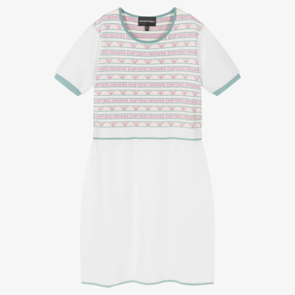 Off-white dress for teen girls by Emporio Armani, designed with teal green and pink logos and Eagle logos woven into the fabric on the bodice. Knitted in a mid-weight viscose blend, this ready-to-wear dress is finished with contrasting green ribbed trims and a comfortable elasticated waistband.
