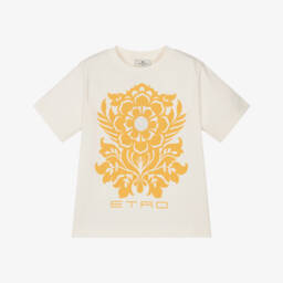 Girls ivory T-shirt by luxury Italian brand Etro, made in soft cotton jersey for relaxed, casual wear. Instantly recognisable, this short-sleeved tee features the designer's name on the front, incorporated into a colourful blue and red paisley print with bright yellow accents.