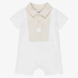 An adorable blue and white shortie for baby boys by Everything Must Change. The jersey bodice has a sweet pointed collar and a pale blue bow tie attached to the chest. The lower body is made in soft, striped seersucker with decorative buttons on the waist and fixed shoulder straps on the front. There are practical popper fastenings on the back and between the legs to help when getting your little one ready for the day.