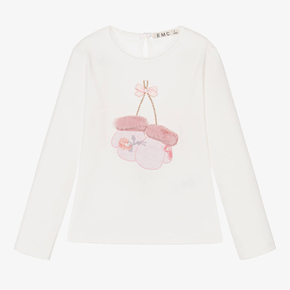 Lovely ivory top for little girls by Everything Must Change, made in soft and comfortable cotton jersey. It has a cute pink mittens motif on the front with fluffy fur cuffs and a sparkling diamanté on the bow. It fastens with a keyhole button on the back.