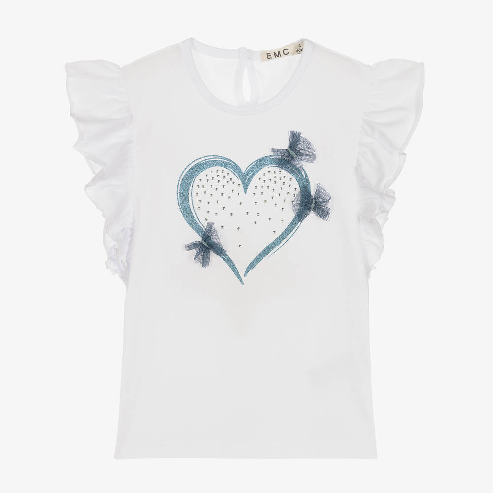 Lovely white T-shirt for girls by Italian brand Everything Must Change, made in soft, comfortable cotton jersey. With pretty ruffles over the shoulders, it has a blue glittery heart motif with silver studs and appliqué blue mesh ribbons on the front. There is a neat keyhole button fastening on the back, making it easier to pop over little one's heads.