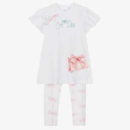 Casual and relaxed, this cotton leggings set for girls is by Italian brand Everything Must Change, made in stretchy jersey. The white T-shirt has positive words in shiny gold and pink flowers, with pretty, frilled sleeves. The pink leggings have a comfortable, elasticated waist, just right for little tummies.