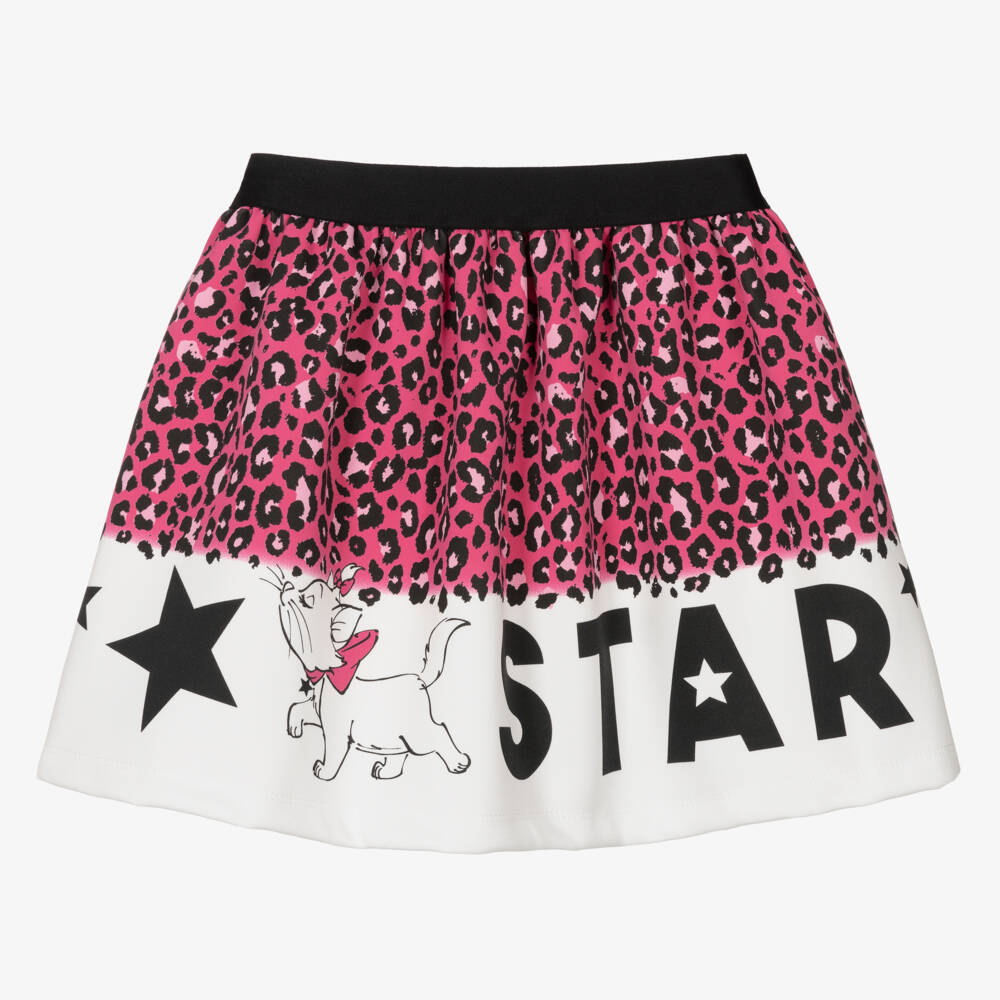 Fun pink leopard print skirt for girls by Everything Must Change, made in soft and stretchy neoprene jersey. Elasticated at the waist, this easy-to-wear style has a white band around the hem, with a cute print of Marie from the Aristocats and the word, 'Star' in black.
