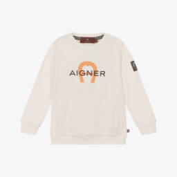 Blue cotton jersey sweatshirt for girls by Fabric Flavours. It has the Wonder Woman logo from ©DC Comics™, Inc. printed on the front in pink and black. There are embroidered pink stars on the sleeves.