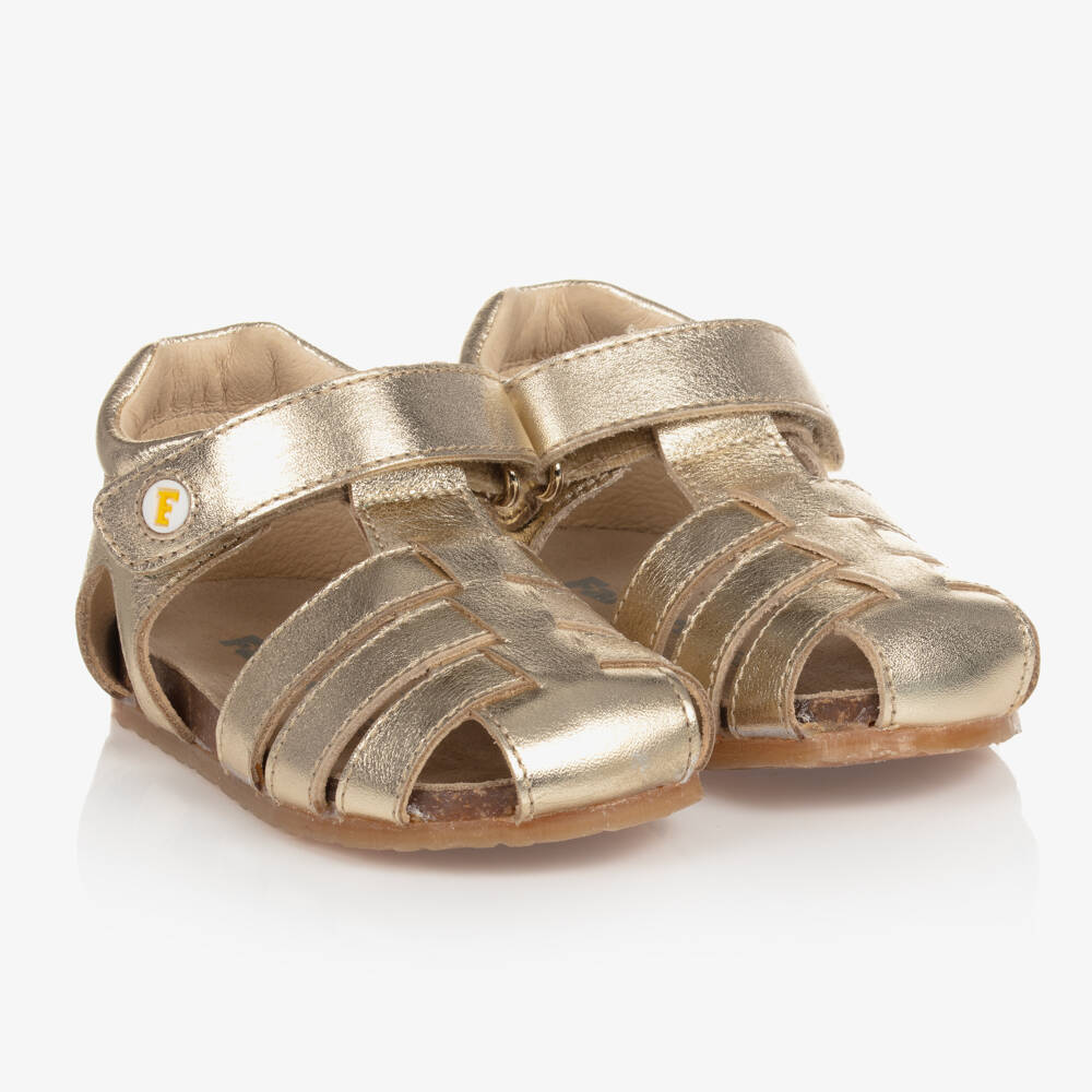 Metallic gold leather sandals for girls, from Italian brand Falcotto by Naturino. Lovely on warm summer days, these breathable shoes have a convenient velcro fastening strap, and a super soft leather lining. The comfortable suede insole provides arch support, while the non-slip rubber sole ensures flexible movement when walking.