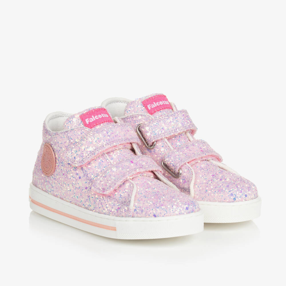 Beautifully handmade, a pair of glittery pink trainers for girls from Falcotto by Naturino. These cute sneakers add sparkle to your little one's outfit, styled with a logo badge and a rubberised motif for a branded element. They fasten using practical velcro straps and have a reinforced ankle and a super flexible rubber outsole. The lining is lightly padded in textile and the insole is made of smooth leather.