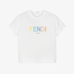 A sweet off-white cotton T-shirt for baby girls by luxury Italian brand Fendi, with a rounded collar. So adorable, the front has the fashion house's iconic 'Baguette' bag motif embroidered in coral pink with a black embroidered slogan underneath. There is a Fendi Roma logo embroidered in tonal white on one sleeve and lovely pearlescent logo buttons to fasten on the back.