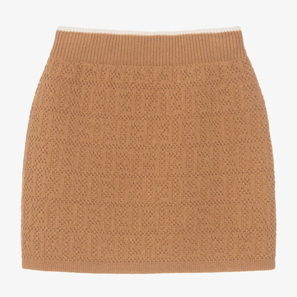 A lovely beige skirt for girls by luxury Italian brand Fendi. Beautifully soft and comfortable to wear, it is knitted in pure wool and has an all-over stamped FF logo. Trimmed in ivory, the waistband is gently elasticated for comfort and ease of dressing.
