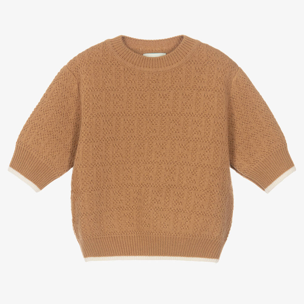 Beige with ivory trims, this lovely short-sleeve sweater for girls is by luxury Italian brand Fendi. Beautifully soft and comfortable to wear, it is knitted in pure wool with an all-over patterned FF logo.