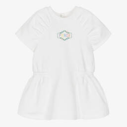Girls ivory hoodie dress by luxury designer Fendi, made in soft cotton jersey for casual comfort. In an oversized fit, it has a pink and purple manga-themed print, with a cool girl holding the brand's beloved Baguette bag. It has 3D ears on the hood for a quirky look.