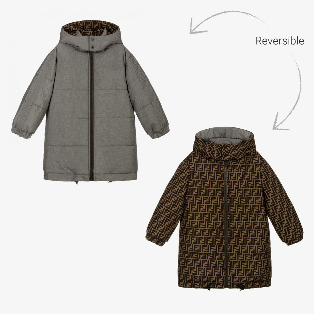 Boys and girls reversible down-filled puffer coat by Italian luxury brand, Fendi. Silky soft, the grey side has an embossed FF logo pattern along the sleeves and two pockets with a warm fleecy lining. The brown side has an all-over black FF logo print and side pockets. The hood is removable and has a popper fastening strap to keep the neck warm. The hem of the coat has an elasticated drawstring to protect from the cold.