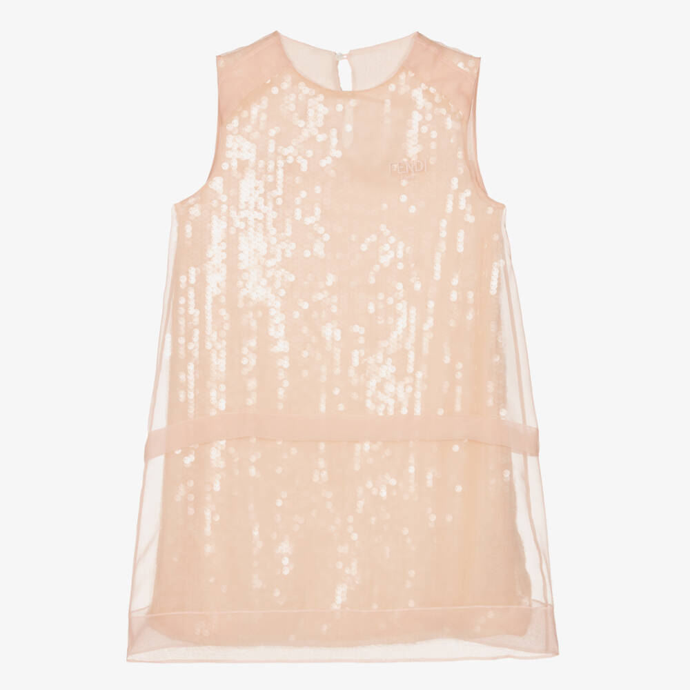 Elegant for teen girls, this pink silk organza dress from luxury Italian brand Fendi has an embroidered logo on the chest. A stylish A-line shape, this beautifully simple design has a sequin tulle underlay to create a stunning shimmering effect. To complete the look, it has a sophisticated keyhole fastening on the back with two concealed mother-of-pearl buttons.