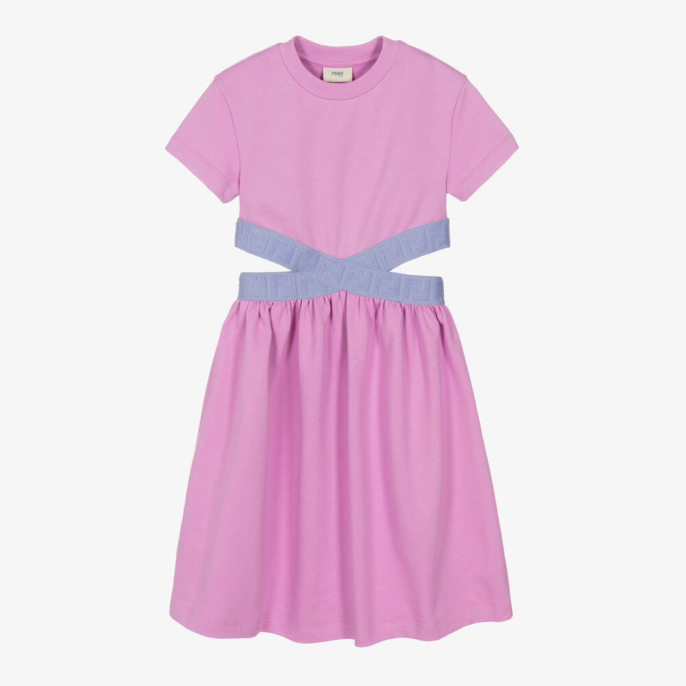 A distinctive lilac purple cotton dress for teen girls by luxury Italian designer Fendi. In a contrast shade of purple, it has a cross-over elasticated waistband with cut-out details, intricately woven with the brand's raised jacquard FF logo. Made in mid-weight sweatshirt jersey, this Italian-crafted dress is cool and easy to wear, simply slipping on over the head.