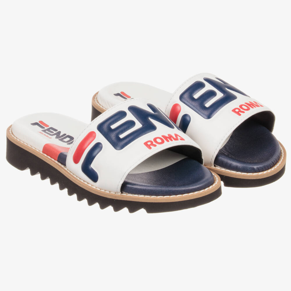 White leather sliders for boys and girls from Fendi, in collaboration with sportswear brand, Fila. These luxury sandals have a blue and red Fendi Mania print. They are fully lined in leather and have a non-slip, deep tread sole.