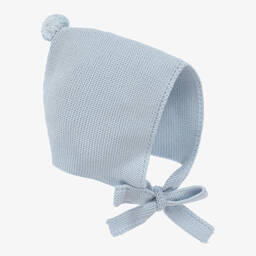 Lovely pale blue bonnet for baby boys by Spanish brand Foque. Knitted in a soft blend of viscose and wool, it has a touch of cashmere for added warmth and luxury. Fastening with knitted ties under the chin, it has a cute pom-pom on the top.