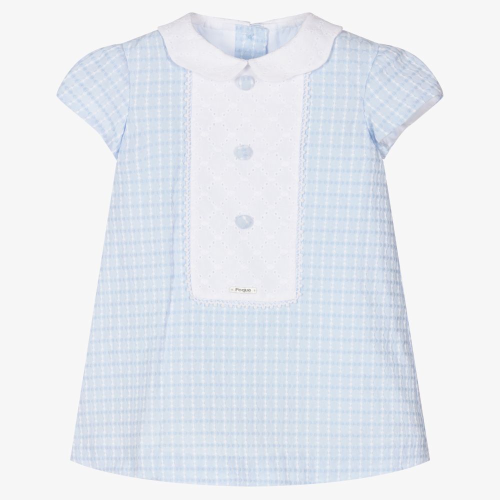 Little girls blue shift dress from Foque, with white broderie anglaise on the front and collar. It is made in mid-weight cotton, with an embroidered check pattern and a soft voile lining. The capped sleeves have gathers on the shoulders and it fastens with buttons on the back.