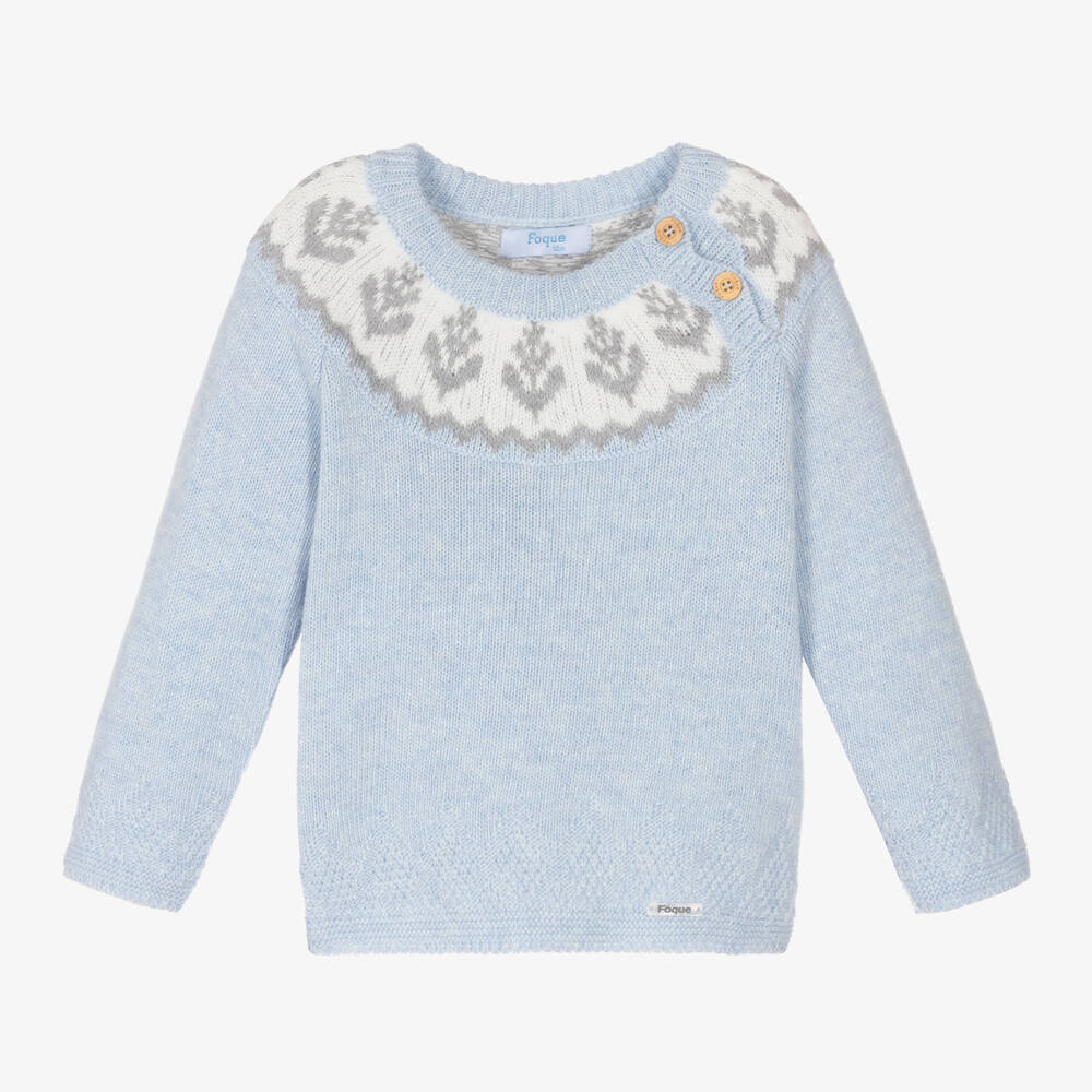 Light blue sweater for younger boys by Spanish brand Foque, knitted in a soft viscose blend. Great for when the weather turns cooler, this cosy sweater has a grey and white knitted leaf design on the chest and a diamond design on the hem and cuffs. There are wooden buttons on one shoulder to make dressing simpler.