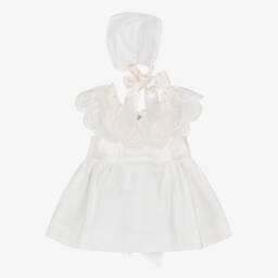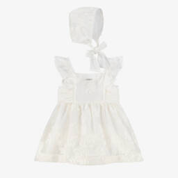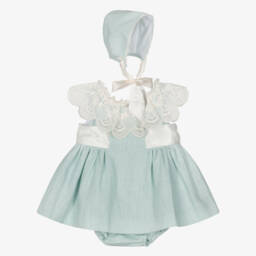So cute for little girls, a navy blue Foque dress with an eye-catching fruit print in yellow, red and green. Made in comfortable lightweight cotton, it has the appearance of a two-piece, with a white bodice and ruffled collar trimmed with striped piping. The puffed sleeves are elasticated and there are further cute ruffles over the shoulders. The brand's logo plate is on the front waist and the dress comes with matching elasticated knickers to complete the look.