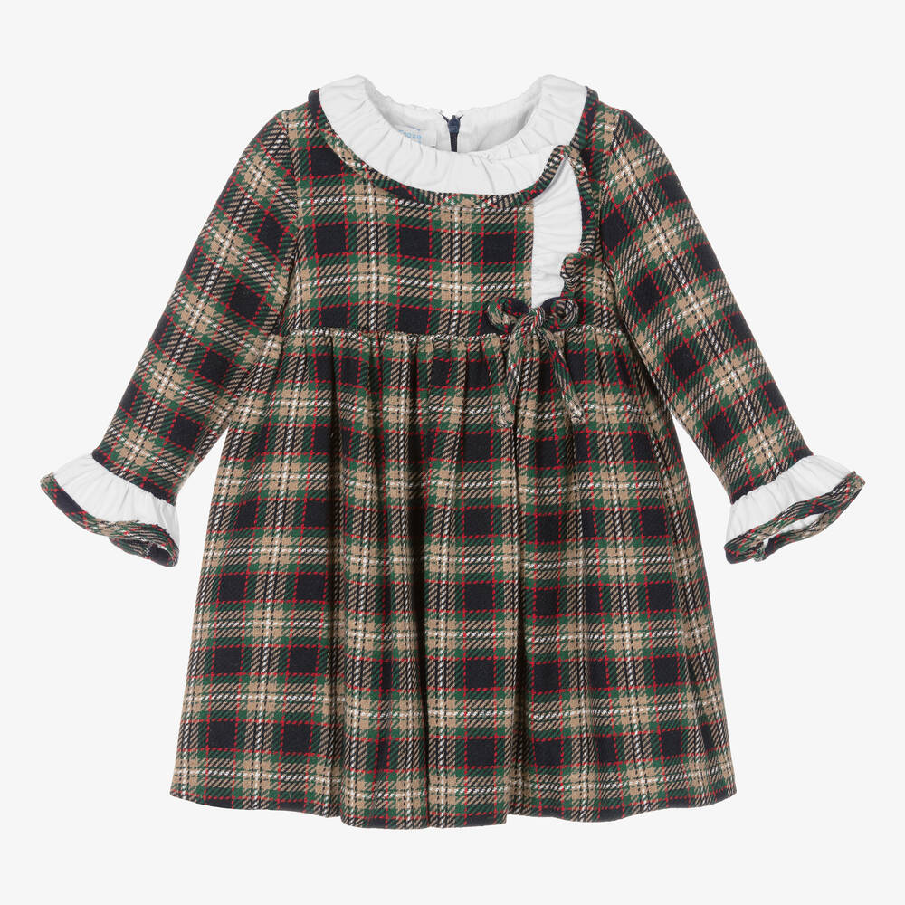 A navy blue, green and beige dress for girls by Foque, made in a soft, mid-weight cotton blend. This classical dress has a tartan check pattern, with a ruffled wrap-effect collar and a fixed bow. There is a concealed zip fastening on the back, and a soft cotton voile lining for comfort,