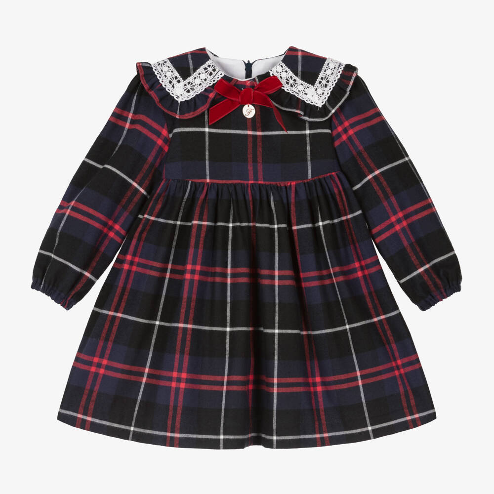 A lovely navy blue and red tartan dress for girls by Foque, woven in soft, brushed cotton twill. Traditionally styled, it has a fixed collar with pretty lace trims and a red velvet bow in the centre. The elasticated cuffs sit comfortably on the wrist and the soft, lightweight lining is gentle on delicate skin. There is a neatly concealed zip fastening on the back.