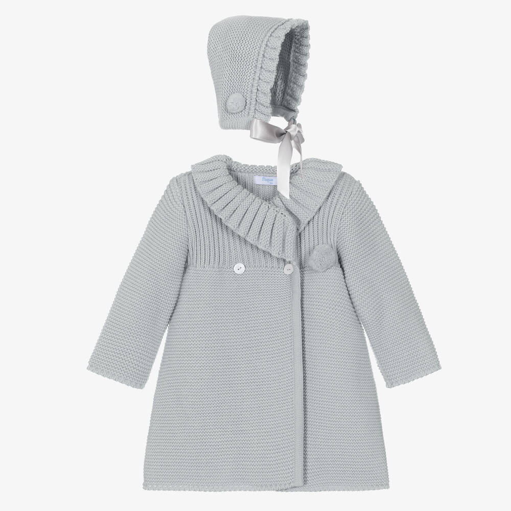 Lovely, traditionally styled grey coat and bonnet set for younger girls from Foque, made in a cosy, mid-weight knit. The coat has double-breasted pearlescent button fastenings and a smart asymmetric collar. A sweet pom-pom on the front adds a fun touch. The matching bonnet fastens with silky ribbon ties under the chin.