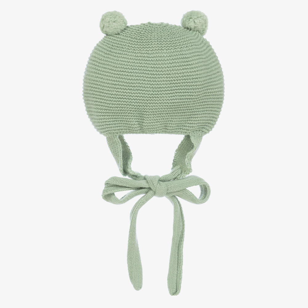 Cute green hat for little boys and girls by Spanish brand Foque, with two small pom-poms on the top. Softly knitted in a garter stitch pattern with a touch of alpaca wool for cosy wear, it has little ear flaps and fastens with knitted ties under the chin.