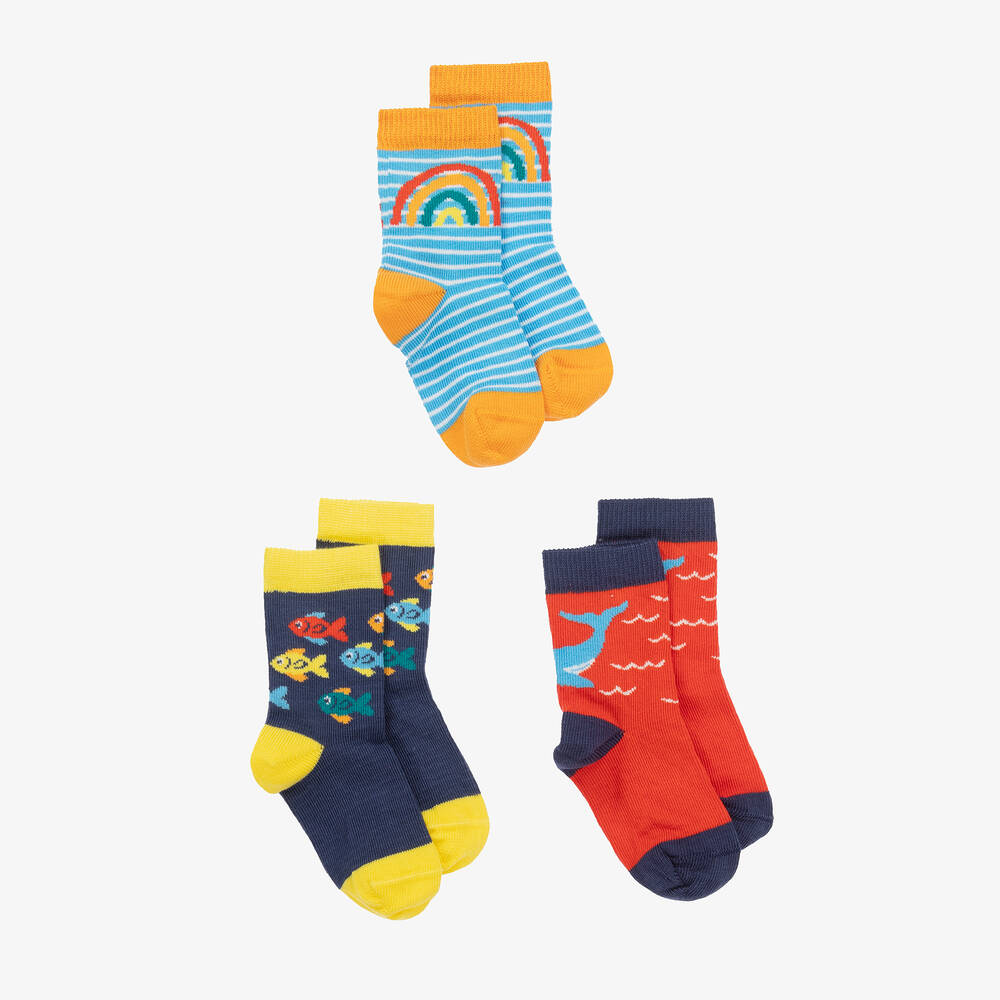 Three pairs of ankle socks for little boys and girls by Frugi, in navy blue, light blue and orange. Soft and stretchy, they are made in an organic cotton rich blend. Two pairs are in a sea life theme and the striped pair has a rainbow motif.