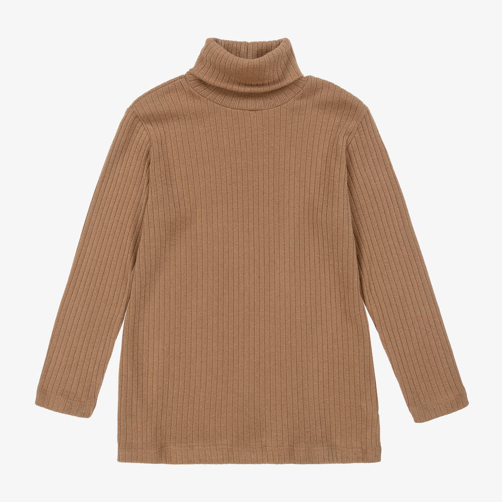 Dark beige sweater for girls by Italian brand Fun & Fun. Knitted in a super soft, viscose blend, it is ribbed, with a cosy polo neck and side vents on the hemline.