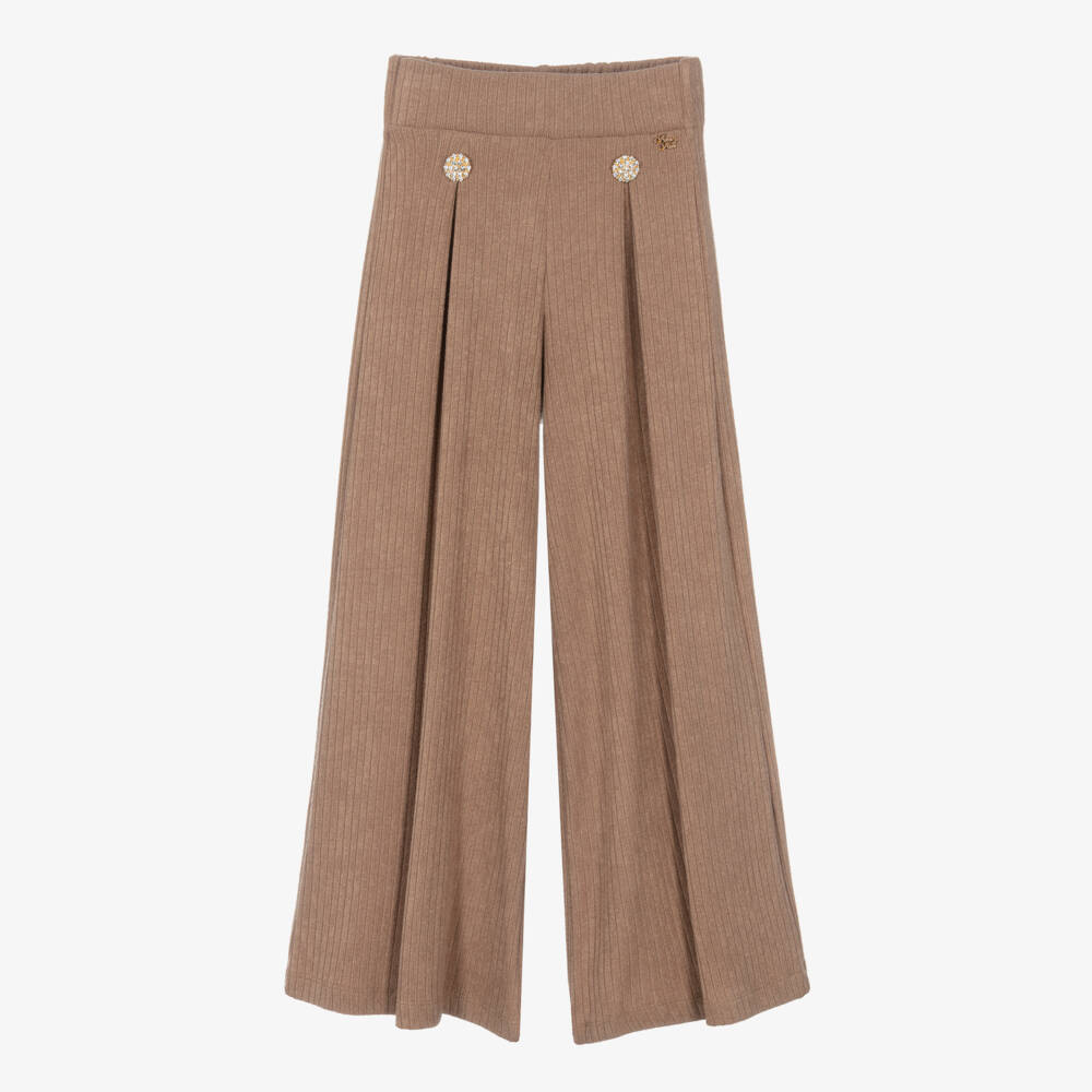 Dark beige wide-leg trousers for girls by Italian brand Fun & Fun. They have decorative, sparkly diamanté buttons on the front, with inverted pleats below to create an elegant flared shape. Endlessly comfortable, they are knitted in a super soft, ribbed, viscose blend and have a deep, elasticated waistband.