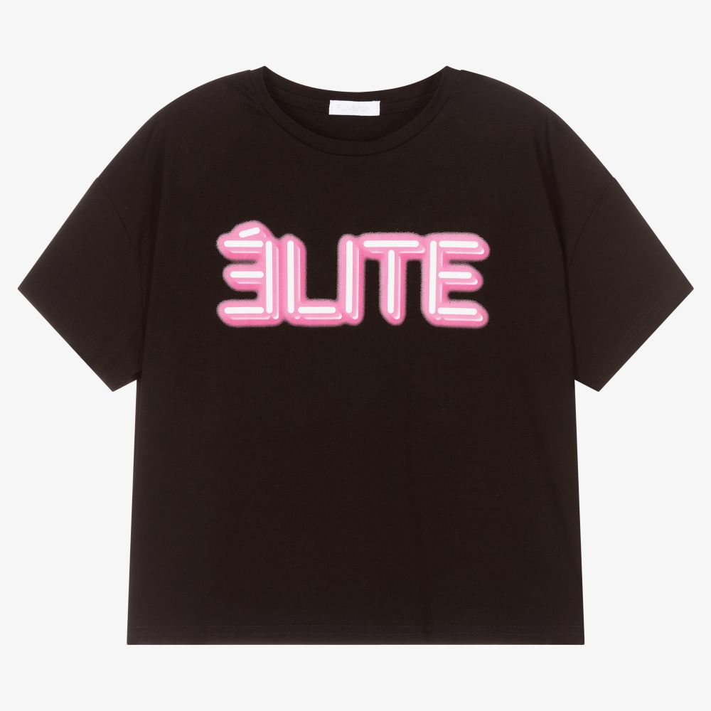 Black boxy cotton T-shirt for girls by Fun & Fun. Soft and stretchy, it has a wide fitting, drop shoulders and short sleeves. There is a bold pink graphic print on the front, with the word 'Elite' in a neon light style lettering.