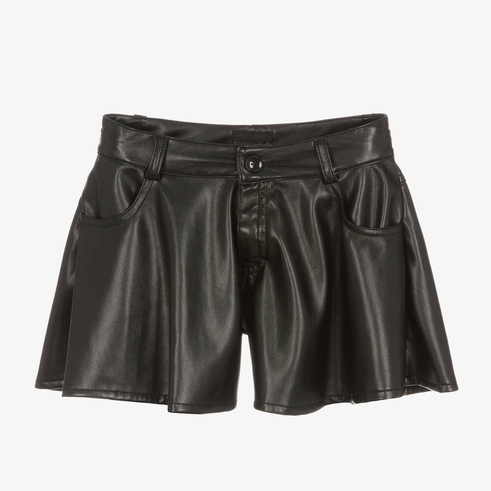 Edgy black faux leather shorts for girls by fashion-forward brand Fun & Fun. They have extra-flared legs for a flattering, skirt-like silhouette with two pockets on the front and two on the back. Smooth and soft with a comfortable stretch, they fasten with a zip and button on the front of the adjustable waist.
