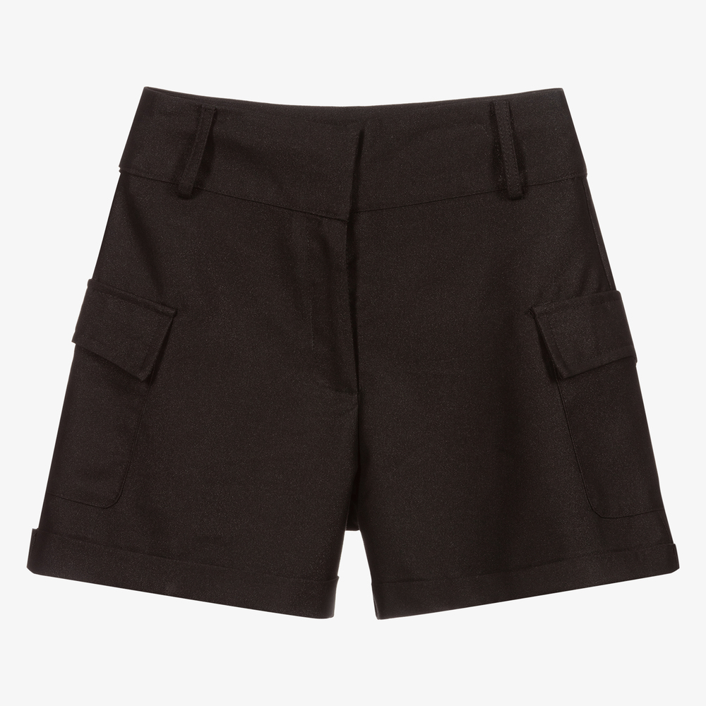 A smart black pair of shorts for girls by Fun & Fun. Smartly tailored, they fasten with a concealed zip and clips. They have pockets at the sides and belt loops.