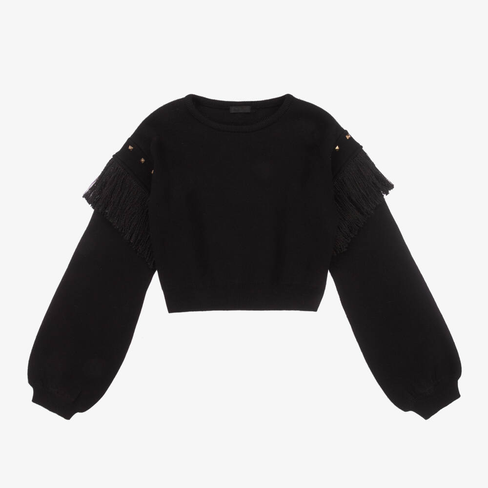 Black sweater for girls by Fun & Fun, in a short and boxy fit with oversized puffed sleeves for a stylishly casual vibe. The dropped shoulders are accentuated with rose gold metal studs and fringing for a unique, statement look. It is made in a mid-weight knit with a touch of wool for added warmth.