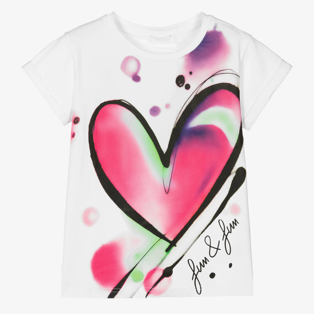 Cute white T-shirt for girls, designed by Fun & Fun. Great for everyday wear, this statement tee has a bold pink heart on the front with graffiti-style trims for an edgy look. Made in soft cotton jersey, it has turned-up short sleeves for a casual finish.