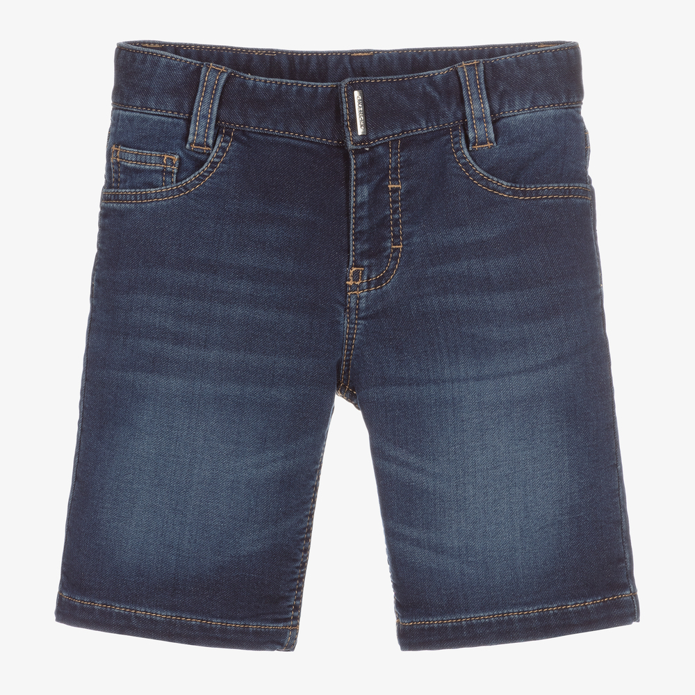 Boys dark blue Bermuda length shorts by luxury brand, Givenchy Kids. Made in soft and stretchy denim-look jersey, they have an adjustable waistband with a logo patch on the back, and fasten with a zip and branded popper. This classic five-pocket style, has an extra concealed pocket on the back that is marked by metal 4G logos.