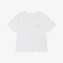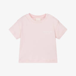 Pale pink T-shirt for little girls by luxury label Givenchy, made in soft cotton jersey. Casual and comfortable, this short-sleeved tee features a statement white, stamp effect Givenchy Paris logo on the back, with a smaller print on the chest. It has a classic crew neckline and poppers on one shoulder to help with dressing.