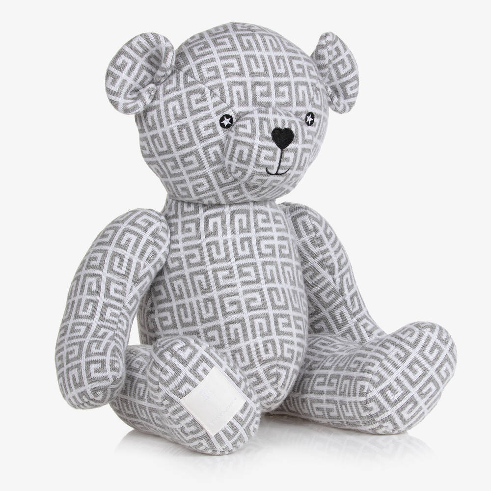 A gorgeous grey and white teddy bear for baby boys and girls by luxury French brand Givenchy. Beautifully knitted in a soft cotton and cashmere blend, it is patterned in the designer's 4G logo for a distinctive designer look. The embroidered eyes and nose add charm and character, and the soft padding make it an ideal cuddling companion. A stunning nursey accessory, this delightful bear has a logo label sewn on the foot for a subtle designer finish.