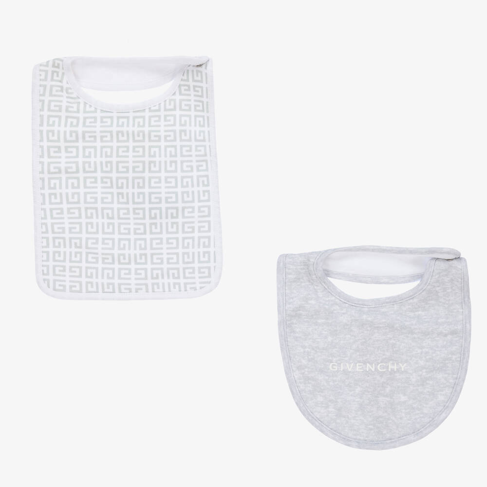 Pack of two grey and white bibs for baby boys and girls by luxury French brand Givenchy. Making an instant designer statement, one bib is patterned in a 4G logo and the other has the designer's name printed across the front. Made in soft cotton jersey, they have an absorbent towelling lining and fasten easily with a popper on the side. Included is a matching grey cotton storage pouch with white branding.