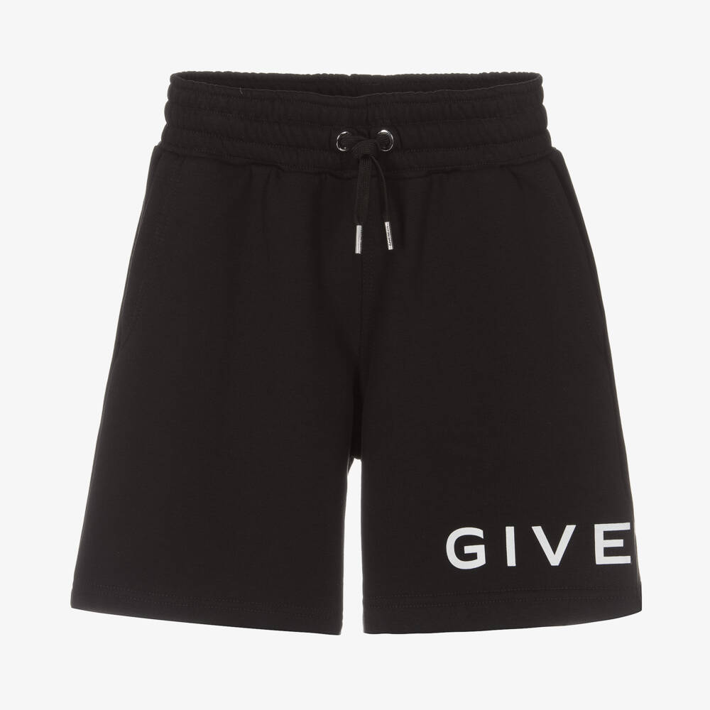 Black shorts for teen boys by luxury French brand Givenchy, as seen in the main collection. They have a white logo print wrapped around one leg and the brand's signature 4G logo print in white on one back pocket. Made in mid-weight cotton sweatshirt jersey, they have front and back pockets and a useful drawstring waist, with silver branded end caps, for a comfortable fit.