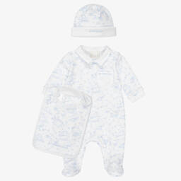 A white and grey babysuit gift set for boys and girls from luxury label Givenchy. Signed with an embroidered logo on the front and branded poppers on the back, the cosy cotton-blend velour babygrow has plush long sleeves, an adorable teddy bear appliqué, and 3D ears below the neckline. The dou dou is made in soft fleece, with a teddy bear motif and knot detail for little hands to explore. Made and lined in cotton, included is a generously sized, padded pouch, great for carrying baby essentials when travelling or for parents as a washbag. It has a useful carry handle, elasticated interior pockets, and an embroidered logo label on one side. An unmistakable pattern from the French brand, both the dou dou and zip-up pouch are enhanced by the famous 4G logo prints.