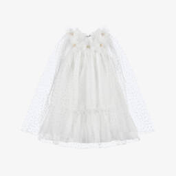 A stunning special occasion dress for girls by Graci, made in white organza with a silver jacquard check pattern. Exclusive to Childrensalon it is designed to shimmer beautifully in the light. This A-line style is decorated on the neckline with silver glitter butterfly brooches, removable for an alternative look. The dress has an exposed zip fastening on the back, with a satin underlayer and a tulle-trimmed cotton lining for added volume.