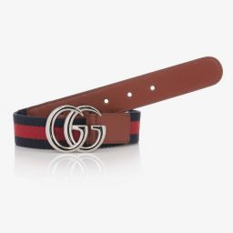 A classic Mini-me navy blue and red striped Web belt for boys and girls from luxury brand Gucci, with dark brown leather trims. The belt fastens with a palladium Double G logo buckle in shiny silver.