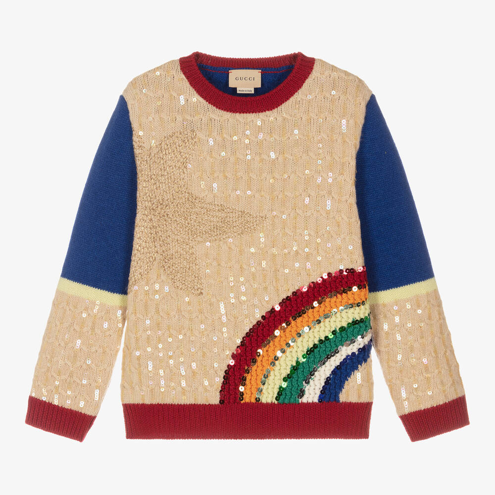 A fun sweater for girls by luxury Italian brand Gucci, signed with a small branded tab on the back. Knitted in soft wool with a subtle raised pattern, it is beige on the front and royal blue on the back. There is a yellow stripe on the sleeves and red ribbing on the cuffs, hem and neck. This gorgeous jumper is decorated with eye-catching iridescent sequins on the front, with a gold star woven on one side, and a colourful rainbow design on the other.