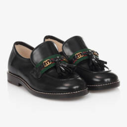 Girls black leather loafer shoes by Gucci. Featuring the brand's classic horsebit feature across the toes, they secure to the foot with a buckle fastening adjustable strap. They have a star print leather lining and inner sole with logo print. They have a leather outer sole with a small heel and non-slip rubber pads.