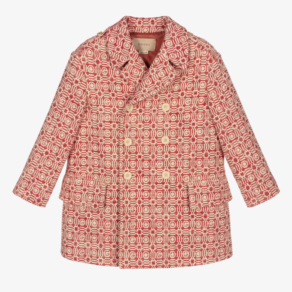 Red and ivory coat for boys by luxury Italian designer Gucci, made in a soft cotton jacquard weave. It is beautifully decorated with the brand's G motif within a repeating pattern. With a traditional feel, it has a notch lapel and double-breasted front button fastenings. It is fully lined in silky cupro and has decorative front flap pockets.