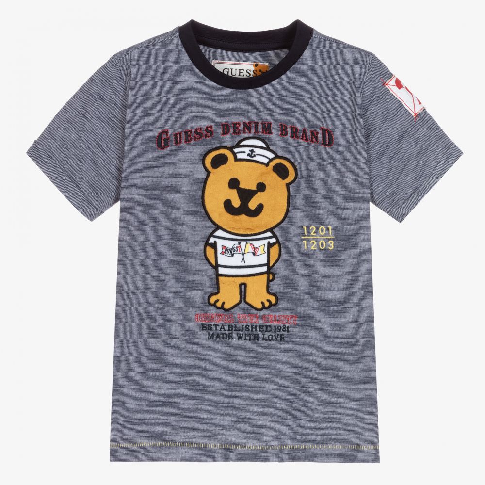 Dark blue T-shirt for boys by Guess, made in soft marled polycotton jersey. It has a cute light brown felted sailor bear appliqué on the front with logo embroidery and the brand's question mark logo on one sleeve.